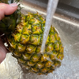 Thoroughly wash pineapple. I use a sponge and the tiniest bit of dish soap. Alternatively, you can use vinegar. Rinse very well.